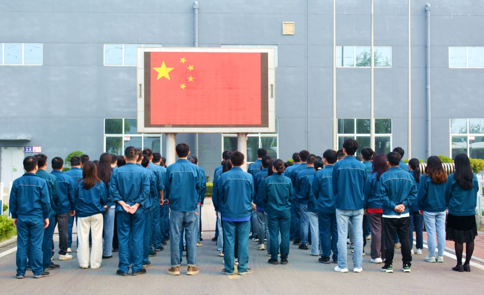 晨曦之中,各基地员工整齐列队。随着国歌声响起,全体肃立,注视着五星红旗冉冉升起,庄严致敬。