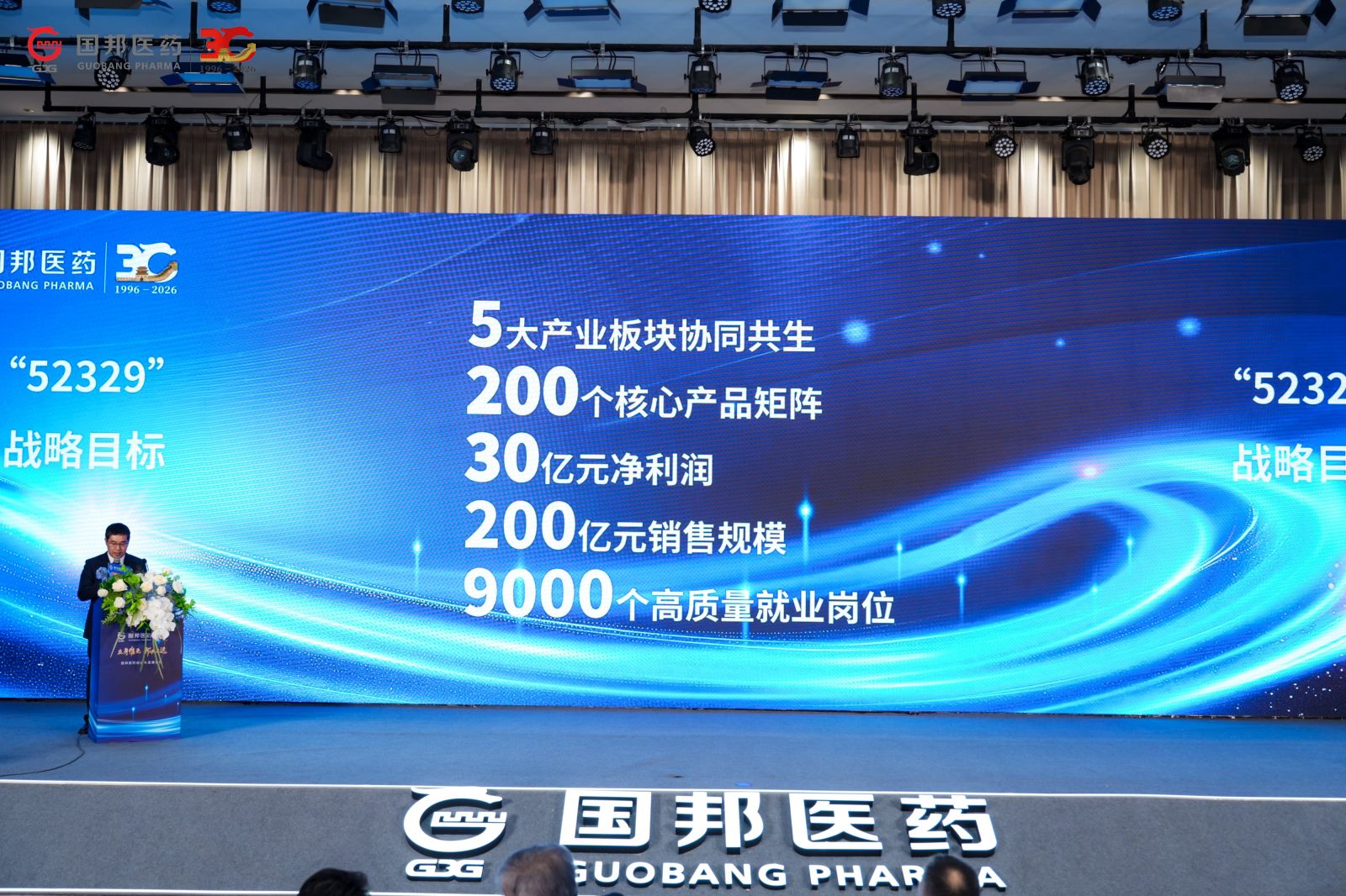 在全场期待中,集团总裁廖仕学发布了《国邦医药2026-2035年战略规划》。廖总表示,未来十年,公司将力争实现“52329”目标:5大产业板块协同共生;200个核心产品矩阵;30亿元净利润;200亿元销售规模;9000个高质量就业岗位。奋力从“制造中心”向“创新高地”跨越,与全球合作伙伴共建共享共赢。